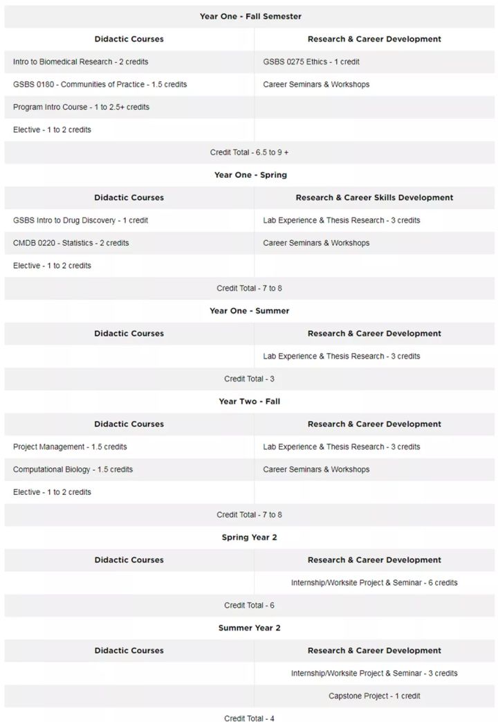 项目需要完成11门课程,涵盖基本的生物医学科学主题、伦理学、项目管理和选修课程。具体课程安排如下: