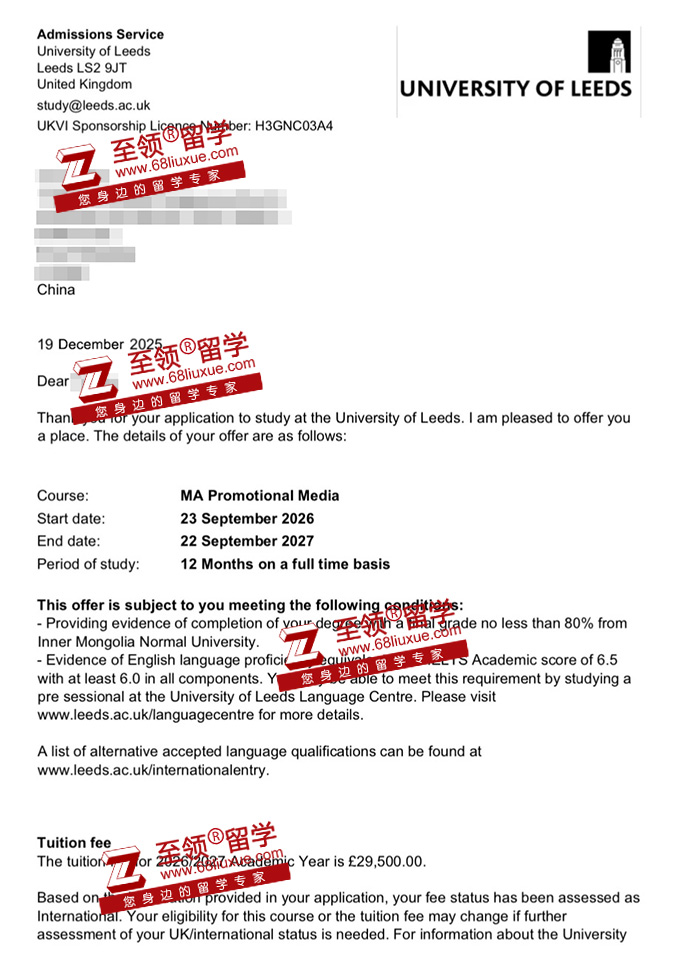 录取结果:利兹大学宣传媒体硕士录取