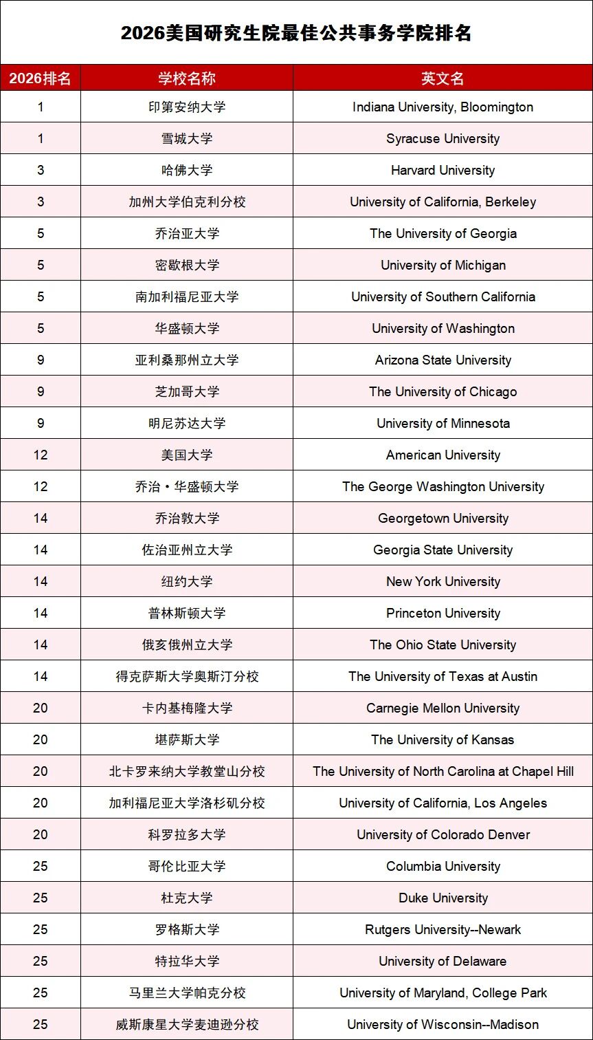 4月7日,U.S.News & World Report 发布了 2026 全美最佳研究生院校排名! 本文为大家盘点美国2026USNEWS最佳研究生公共事务学院排名。