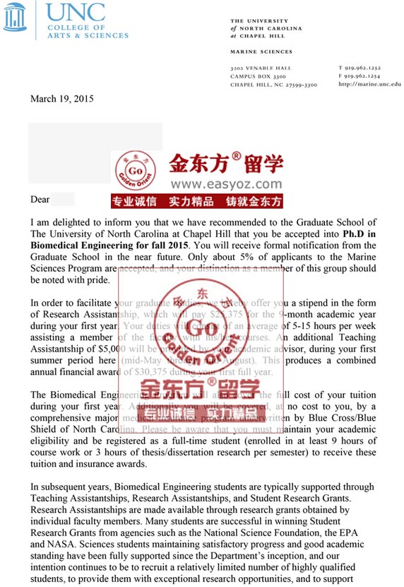 录取结果:北卡教堂山生物医学PhD奖学金