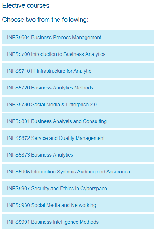 1年半全日制课程:上11门课,4门core 1课程,4门core 2课程,2门选修课,再加1门capstone课程,要求有1年的相关工作经验。