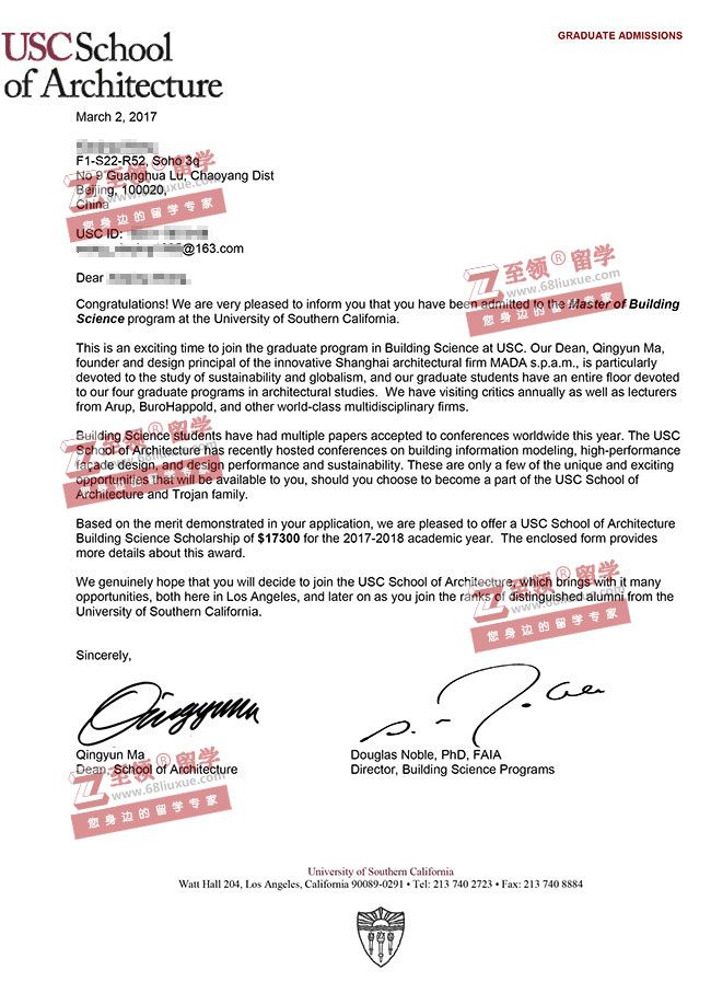 录取结果:南加州大学,Master of Building Science建筑科学硕士,奖学金$17300